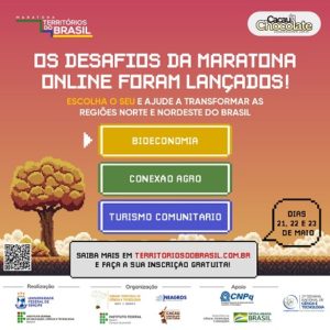 O Instituto Federal Baiano-campus Uruçuca, IF Baiano campus Guanambi e a Universidade Federal do Sergipe, com a parceria do Movimento Cacau Chocolate e Cultura promovem em maio a Maratona Territórios do Brasil, um evento de inovação online e gratuito, que busca soluções que ajudem a potencializar o desenvolvimento das regiões Norte e Nordeste do Brasil. As inscrições começam nesta quarta-feira, dia 7; A Maratona tem o apoio do site Cacau&Chocolate.