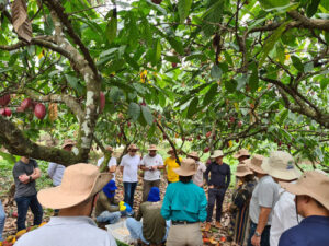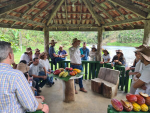 O grupo visitou a área de cultivo de cacau, onde acompanhou as práticas sustentáveis que estão transformando a cultura de produção. com a aplicação de pesquisa e inovação.