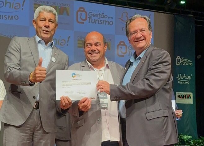 O prefeito Nego de Saronga (PT) representou Itacaré no Seminário de Gestão em Turismo, nesta quarta-feira (7), no novo Centro de Convenções de Feira de Santana. Das mãos do governador Jerônimo Rodrigues (PT), o gestor municipal recebeu o certificado que simboliza a consolidação do paraíso sul-baiano no Mapa do Turismo Brasileiro, do Ministério do Turismo, e celebrou o reconhecimento nacional do destino.