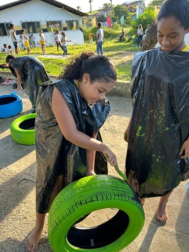 Na última sexta-feira, 23, foi realizada a segunda fase do projeto, com a pintura de pneus que serão utilizados na próxima etapa, destinada à requalificação de um ponto de descarte irregular de resíduos, localizado na entrada da escola. A ação foi marcada pelo entusiasmo e a criatividade das crianças, que participaram ativamente da atividade.