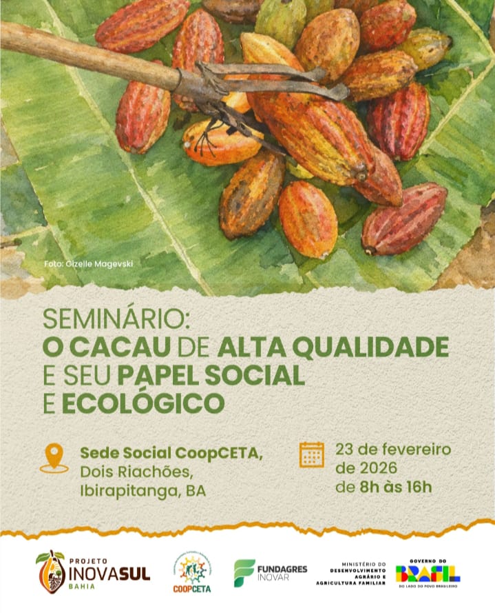 Será realizado no próximo dia 23, o seminário “Cacau de alta qualidade e seu papel social e ecológico”. O evento acontece a partir das 8 horas na sede da Cooperativa dos Assentados, Acampados e Quilombolas do Sul da Bahia (COOPCETA), localizada no assentamento Dois Riachões, em Ibirapitanga, no Baixo Sul da Bahia.