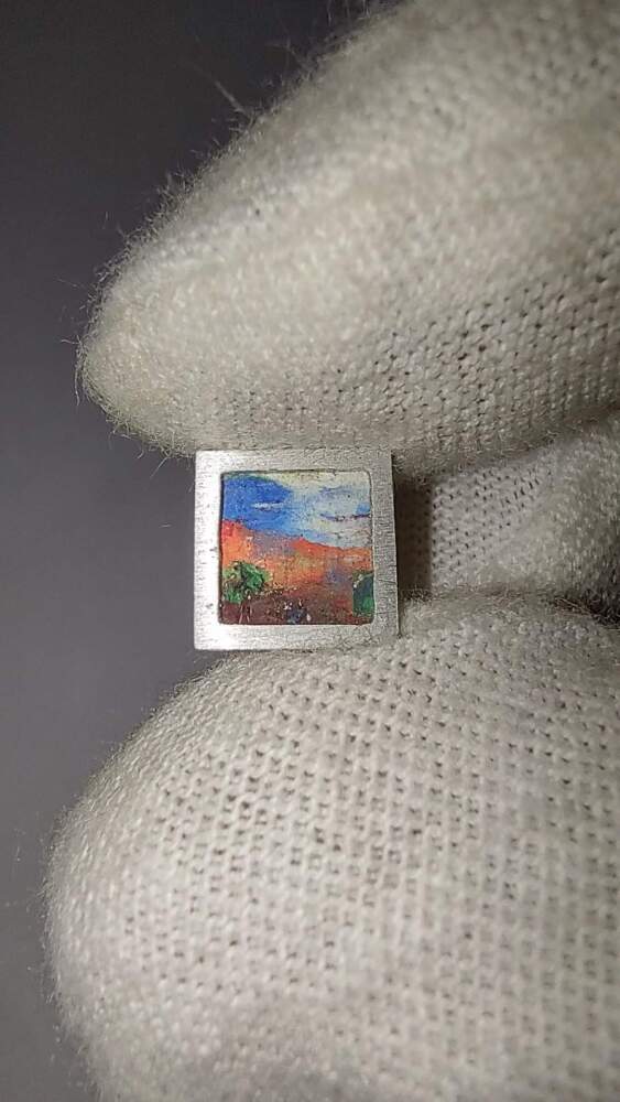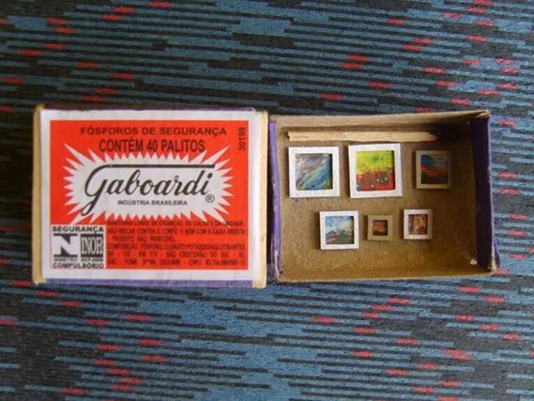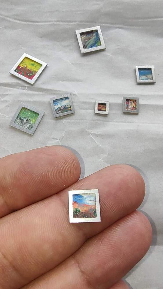 Micro telas: Ele cria molduras extremamente pequenas e pinta miniaturas complexas em seu interior, muitas vezes usando lupas e ferramentas de joalheiro.