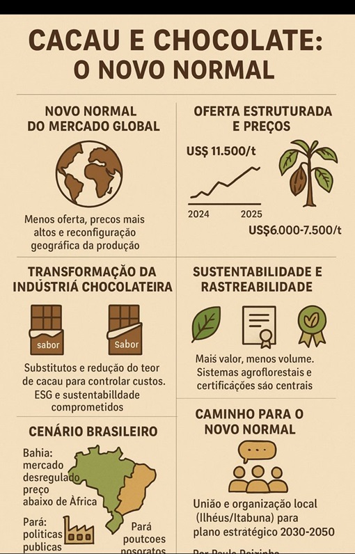 O novo normal do cacau é menos volume e mais valor. A sustentabilidade e rastreabilidade passa a ser eixo central de competividade, expansão de sistemas agroflorestais, certificações e pagamentos por serviços ambientais. Recentemente, O Regulamento de Desmatamento da União Européia (EUDR) que proíbe a entrada de produtos no mercado da EU, prorrogou apenas por seis meses para o cacau, produtos e chocolates africano, fazendo o mercado elevar os preços.
