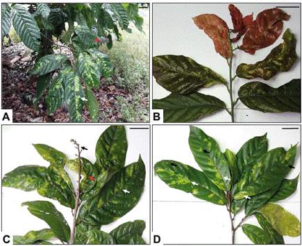Figura 2. Folhas de Theobroma cacao apresentam sintomas semelhantes aos observados em plantas infectadas por vírus, com manchas cloróticas e enrugamento. (A) Cacaueiro de um genótipo com setas apontando para uma folha saudável e assintomática (seta preta) e folhas afetadas, apresentando clorose em manchas distribuídas principalmente ao longo da nervura central da folha (seta branca) e enrugamento (seta vermelha). (B) Folhas novas apresentando clorose e enrugamento. (C) Ramo com setas apontando para folhas adultas que apresentam sintomas semelhantes aos de uma virose, como clorose (seta branca), crescimento unilateral irregular devido a enrugamento (seta vermelha) e queda prematura das folhas, encurtamento dos entrenós e proliferação de ramos laterais característicos da “engurruñadera” (seta preta). (D) Galho originado de embriogênese somática, com setas apontando para folhas adultas com clorose na forma de pequenas manchas (setas pretas) e em manchas distribuídas ao longo da nervura central da folha (setas brancas) e distantes dela. Escala: 50 mm.