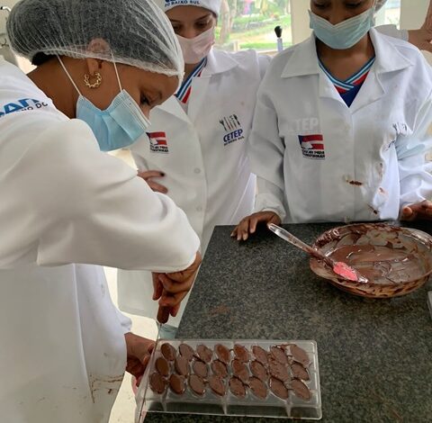 A produção de ovos e barras de chocolate na Escola-Fábrica de Chocolate do Baixo-Sul, sediada no Centro Territorial de Educação Profissional (Cetep) de Gandu, ganhou fôlego com a proximidade da Semana Santa. À frente estão os estudantes do curso de Nutrição e Dietética do Cetep, que, em sala de aula, adquirem conhecimentos nutricionais e aprendem as técnicas a serem aplicadas nas aulas práticas. Na fábrica-escola, as professoras explicam como é o processo de fabricação do chocolate a partir do cacau, proporcionando aos alunos novos conhecimentos para fins domésticos ou empreendedores.